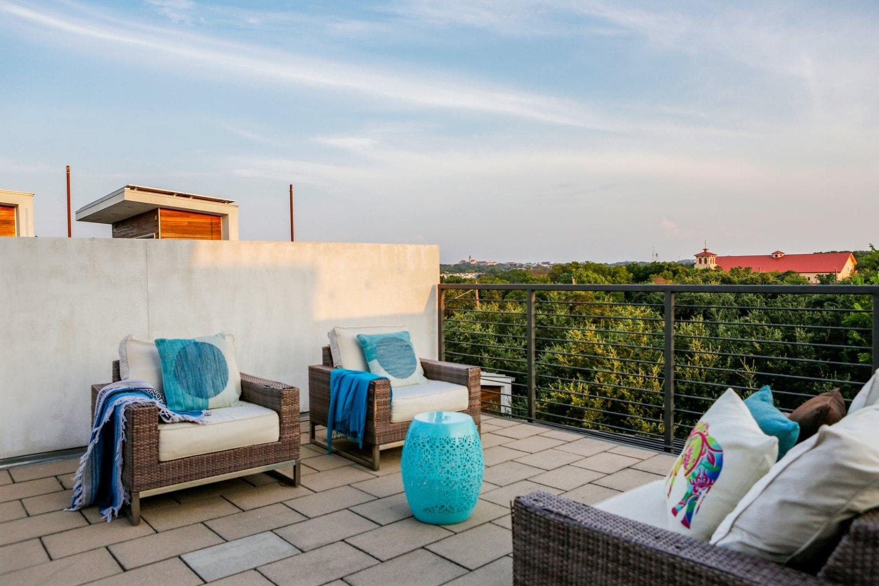 The third floor has a second bedroom with a full bathroom. Located on the other wing, is the large master bedroom with oversized sliders leading to the second balcony. Again, the perfect amount of privacy is provided by the mature trees to allow the sliders to be open and full enjoyment! The Master bathroom has a soaking tub, walk-in shower, double sinks, and a walk-in closet. Located off the master bedroom, is the rooftop deck! Views of downtown Austin to the North and St Edwards from the South. There isn't a better spot to watch the 4th of July fireworks! Watch a football game, grill or simply enjoy a glass of wine on this 800 square ft private deck! Plumbing is ready to go for a wet bar as well!